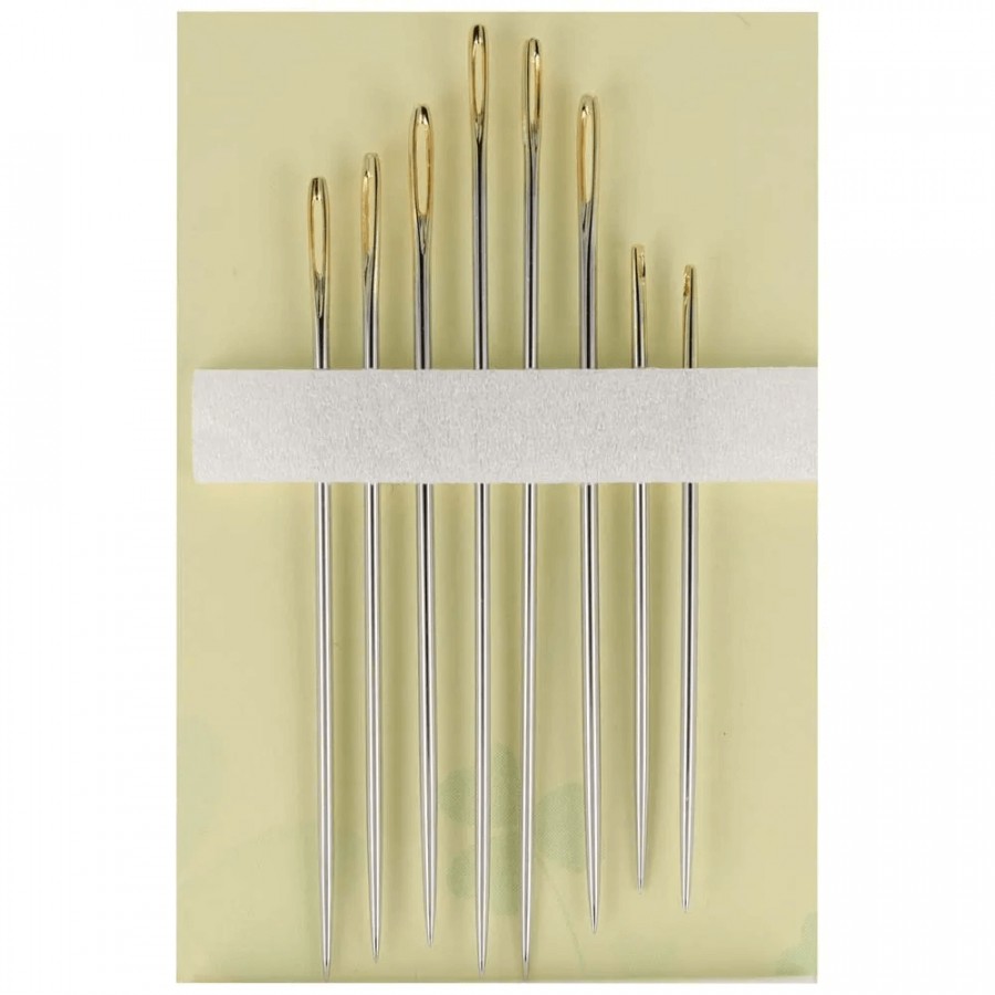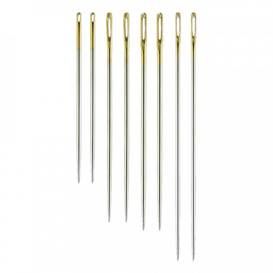 Están fabricadas en acero templado y tienen un ojo ovalado chapado en oro y una punta afilada. Esto las convierte en agujas fuertes y resistentes que se deslizan suavemente sobre la tela sin doblarse ni romperse.