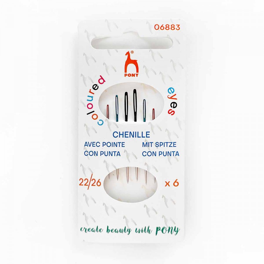 Pack de 6 agujas chenille o con punta PONY Black. Con ojales de colores para diferenciar cada grosor de aguja. Recomendadas para bordado y con hilos Mouliné y perlé fino.