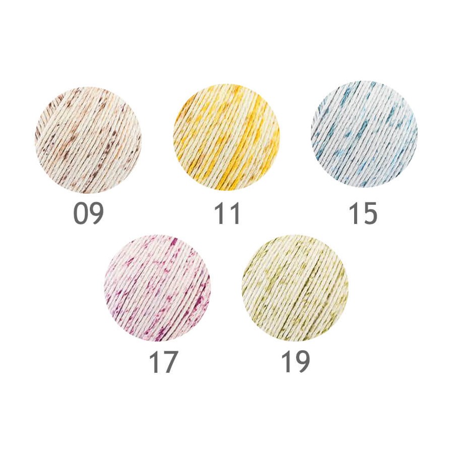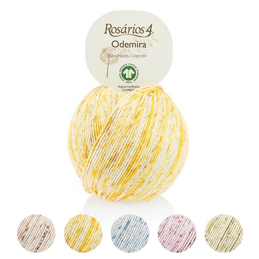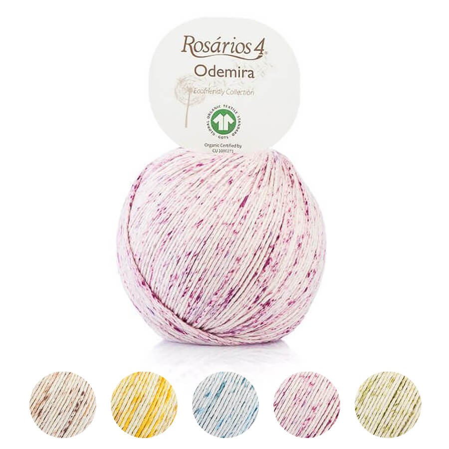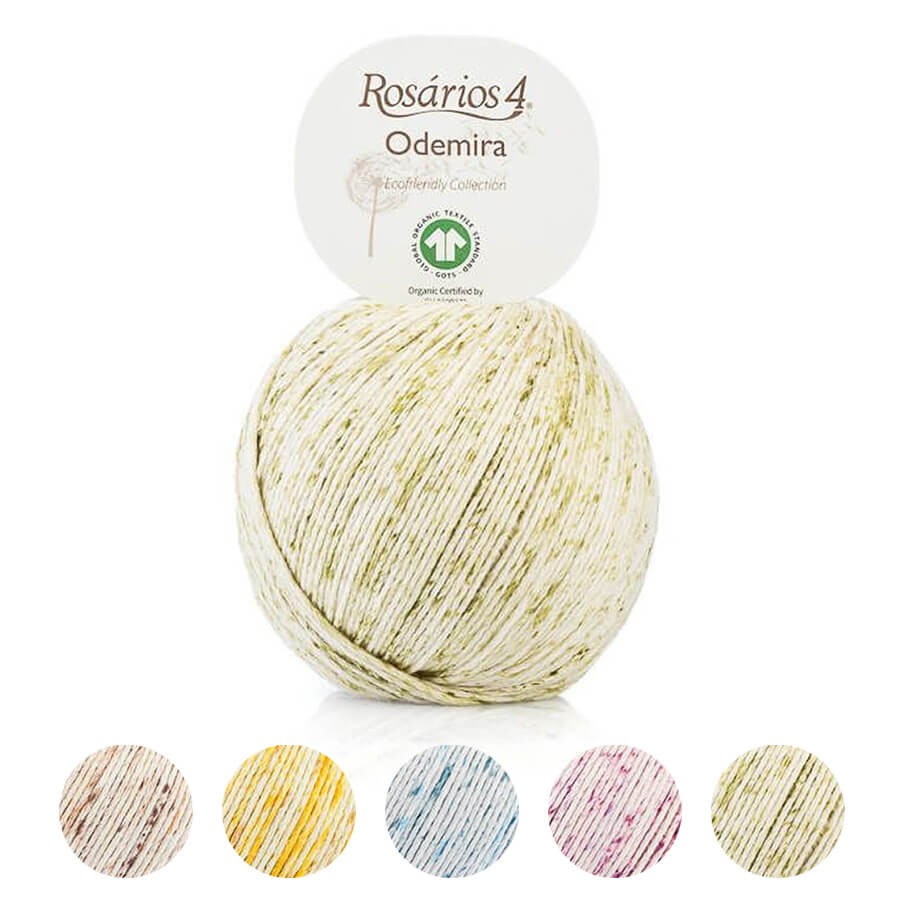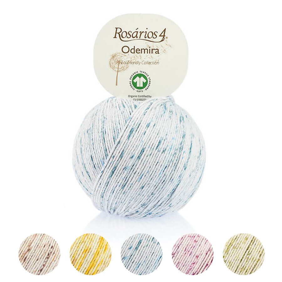 Odemira es un hilo de algodón orgánico 100% con certificado GOTS. Teje prendas con un color suave y moteado gracias al efecto spray de su teñido.
