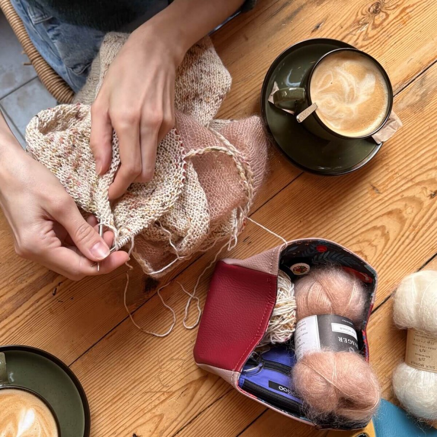 Convierte este estuche en tu cuenco lanero de viaje: sácalo de tu bolso, coloca tu ovillo y teje tomándote un café entre amigas. Así de fácil y cómodo.