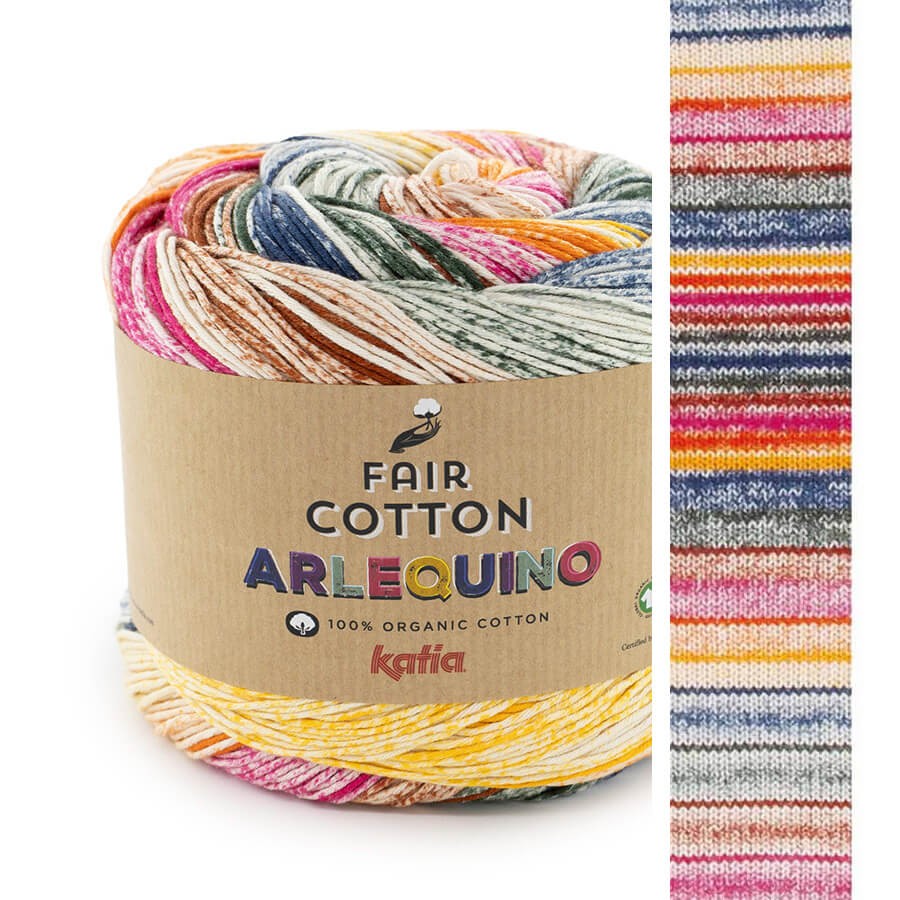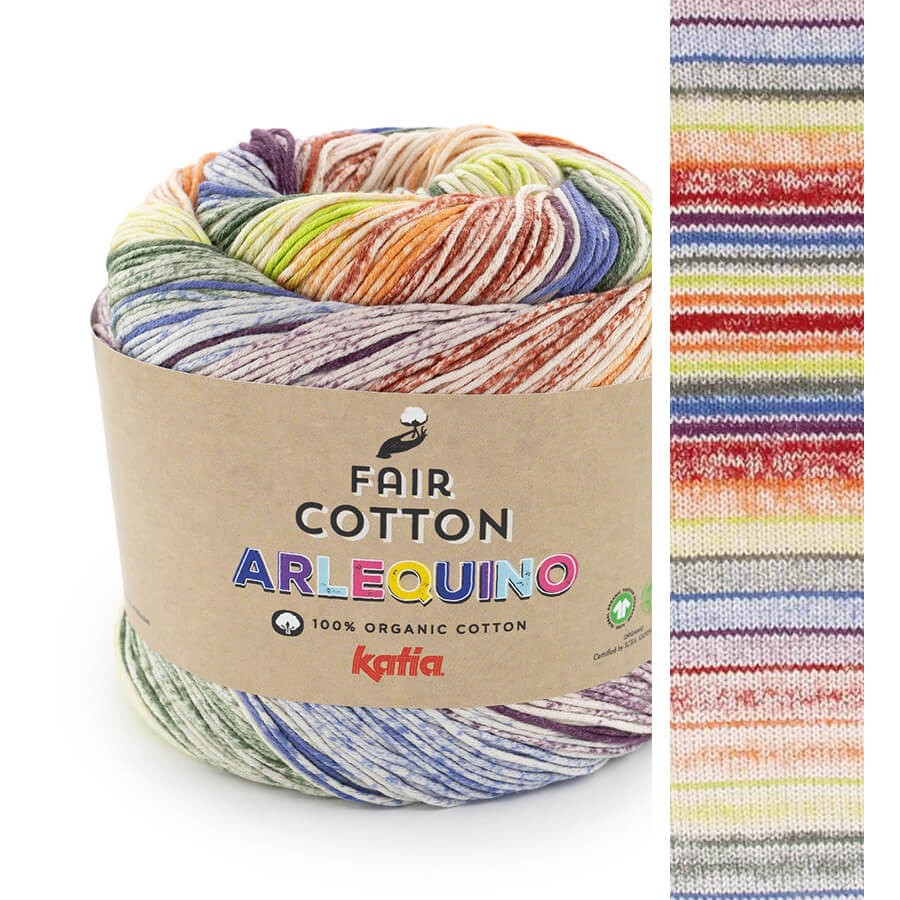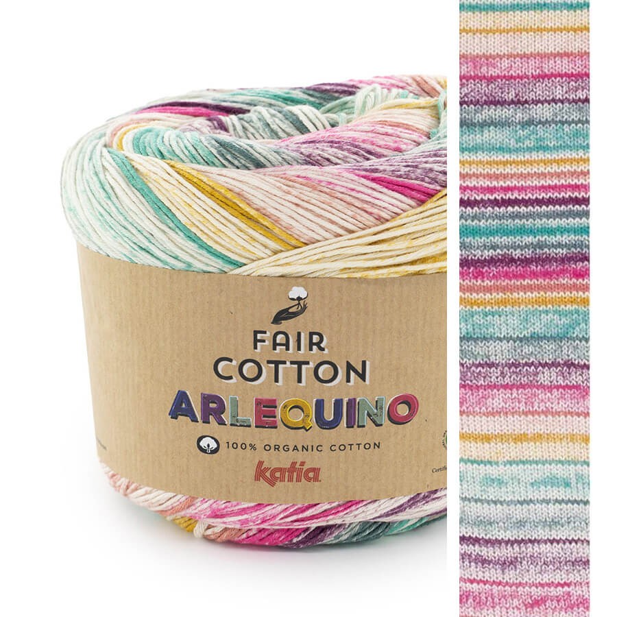 Ovillos de algodón orgánico con estampado en ciclo perfecto y efecto espejo. Las suaves transiciones cromáticas crean simetrías únicas, ideales para prendas frescas y alegres.