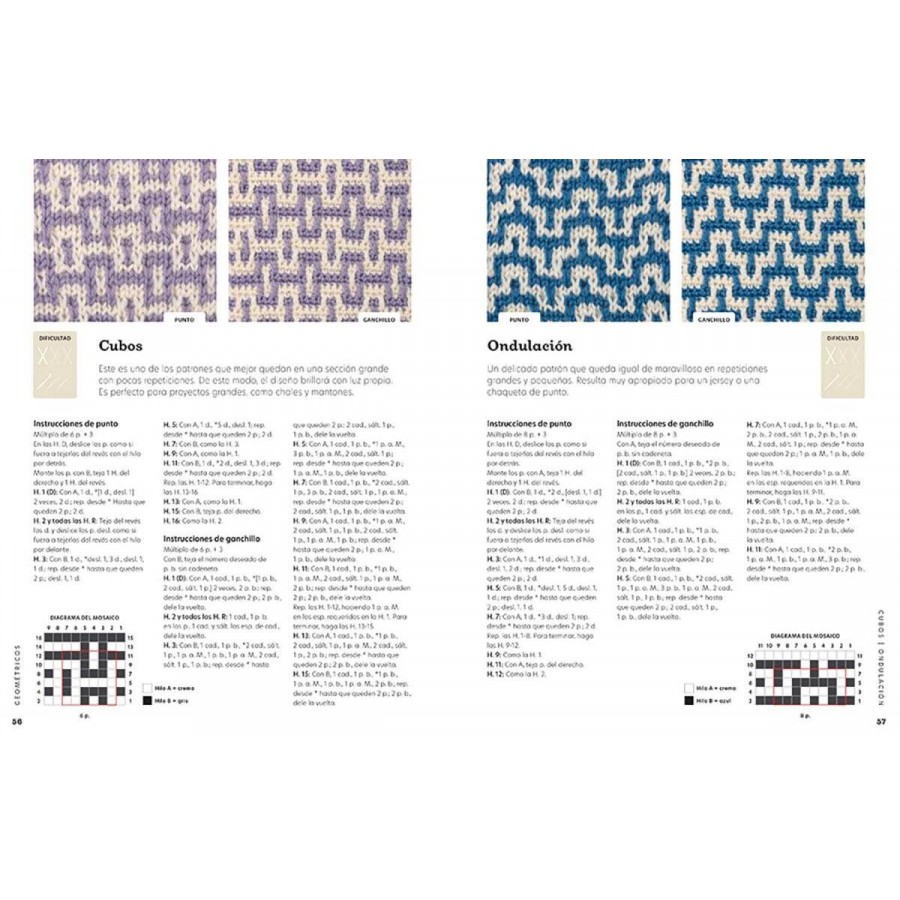 Cada patrón incluye fotografías de muestras tejidas de ambas maneras, un diagrama e instrucciones escritas.