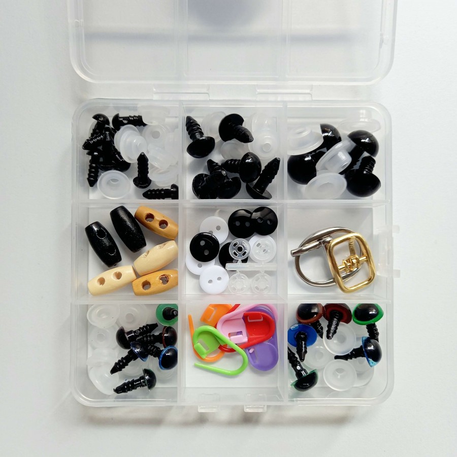 Contiene ojos de seguridad, cierres, hebillas, botones y marcadores.