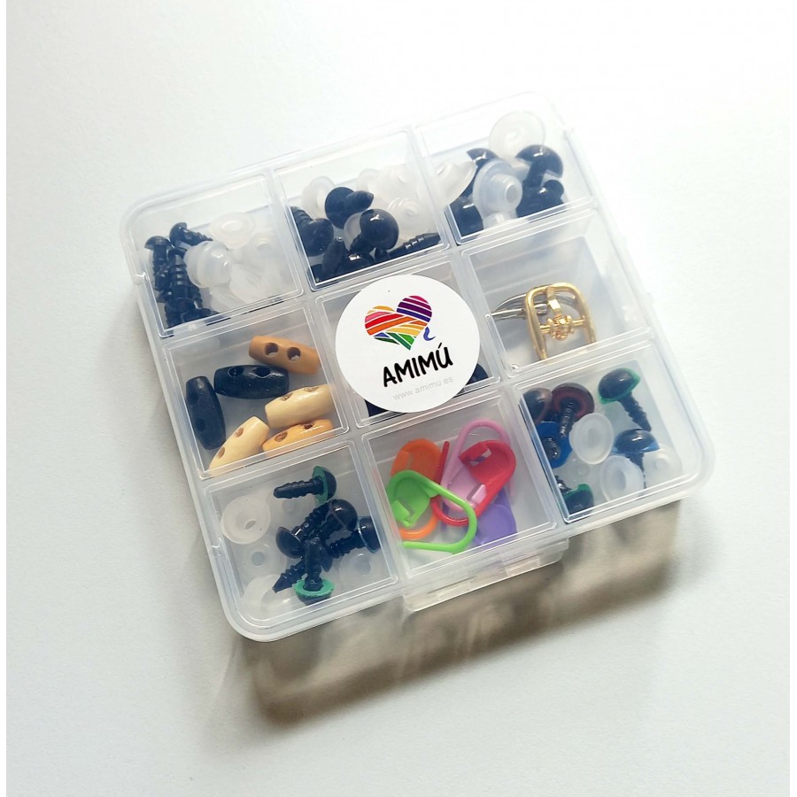 Con esta caja tendrás todos los accesorios básicos para crear tus amigurumis. Podrás rellenarla después con tus imprescindibles según vayas utilizándolos.